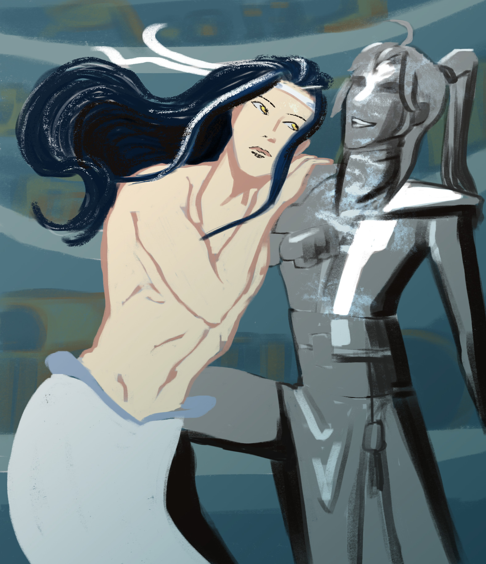 Today, she’d given him a strange look, before grasping his hands in her own, perched in front of him on her padded bedding. He noticed that her long, black hair was missing its usual silver adornments; only the blue forehead ribbon remained.